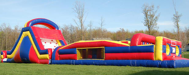 Great fun is sure it be had by all with this fun and colorful large obstacle course, with more the 60 ft of run through and slide, 2 lanes wide enough for 2 at a time. This unit will keep the kids engaged all day long.