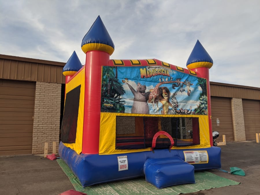 Mesh windows allow adults and spectators to see what's going on inside the inflatable, and a safety ramp at the entrance/exit allows for safe and easy access to the jumper. Madagascar Zoo Animals themed banner will be on your choice of Large Bounce House (15x15)