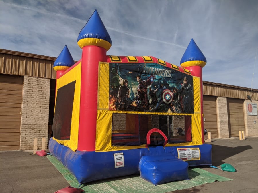 Enter the Marvel Universe inside this Avengers Jumper! This Avengers bounce house lets your kids imagination take off in high gear with fun and excitement inside this Avengers themed bouncy house. Which Avenger super hero will they be? Join Iron Man, Thor, Hulk, Captain America, Captain Marvel as they defend your right to have an amazing birthday party. Avengers Themed banner will be on your choice of a Large Bounce House (15x15).