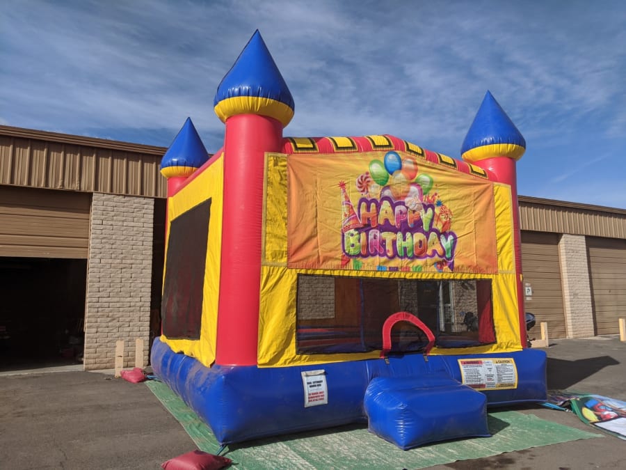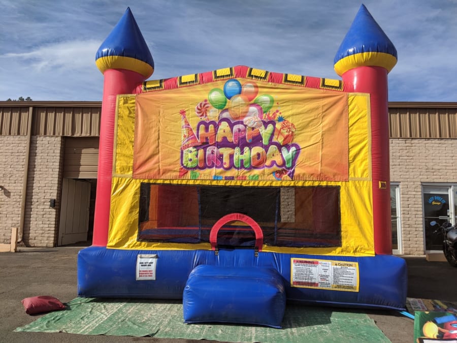 Happy Birthday Themed banner will be on your choice of any large bounce house (15x15).
