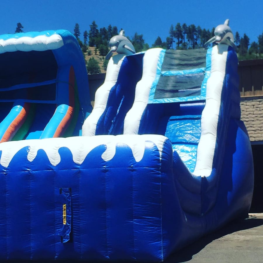 Cool off this summer by riding the waves with the dolphins on our fun and cool 18' dolphin water slide.