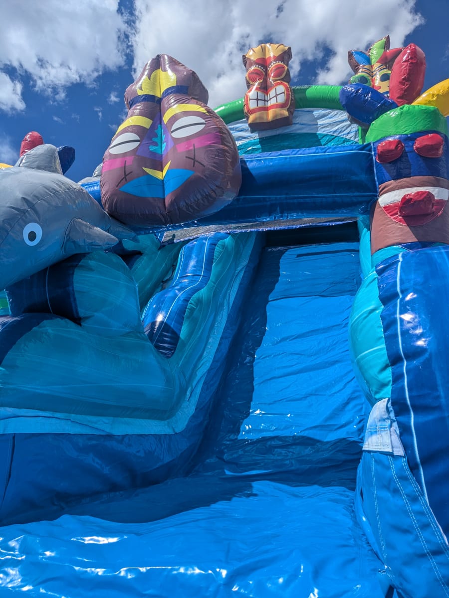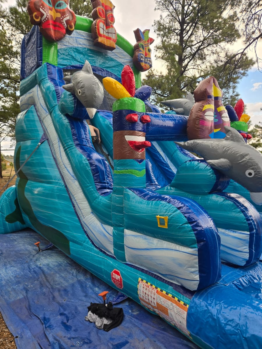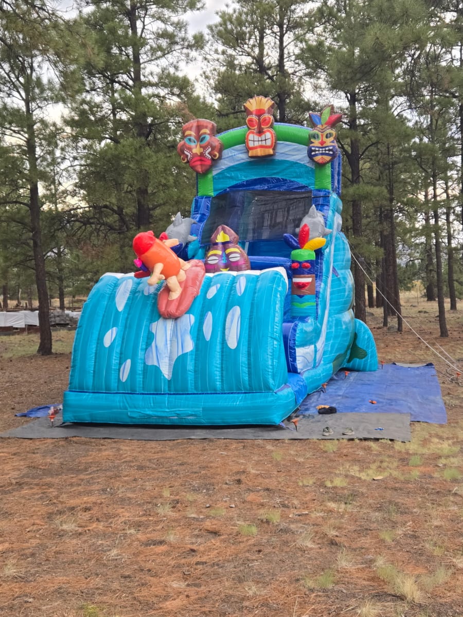 Bring instant fun to any event with the Tiki Wet Slide or Dry Slide. This 18' tiki water slide delivers big thrills for kids, teens, and even adults. Use it wet for fast splashes or dry for safe summer play. Perfect for party rentals and backyard celebrations in Flagstaff, Coconino County, Sedona, Winslow, Williams. πŸŽ‰